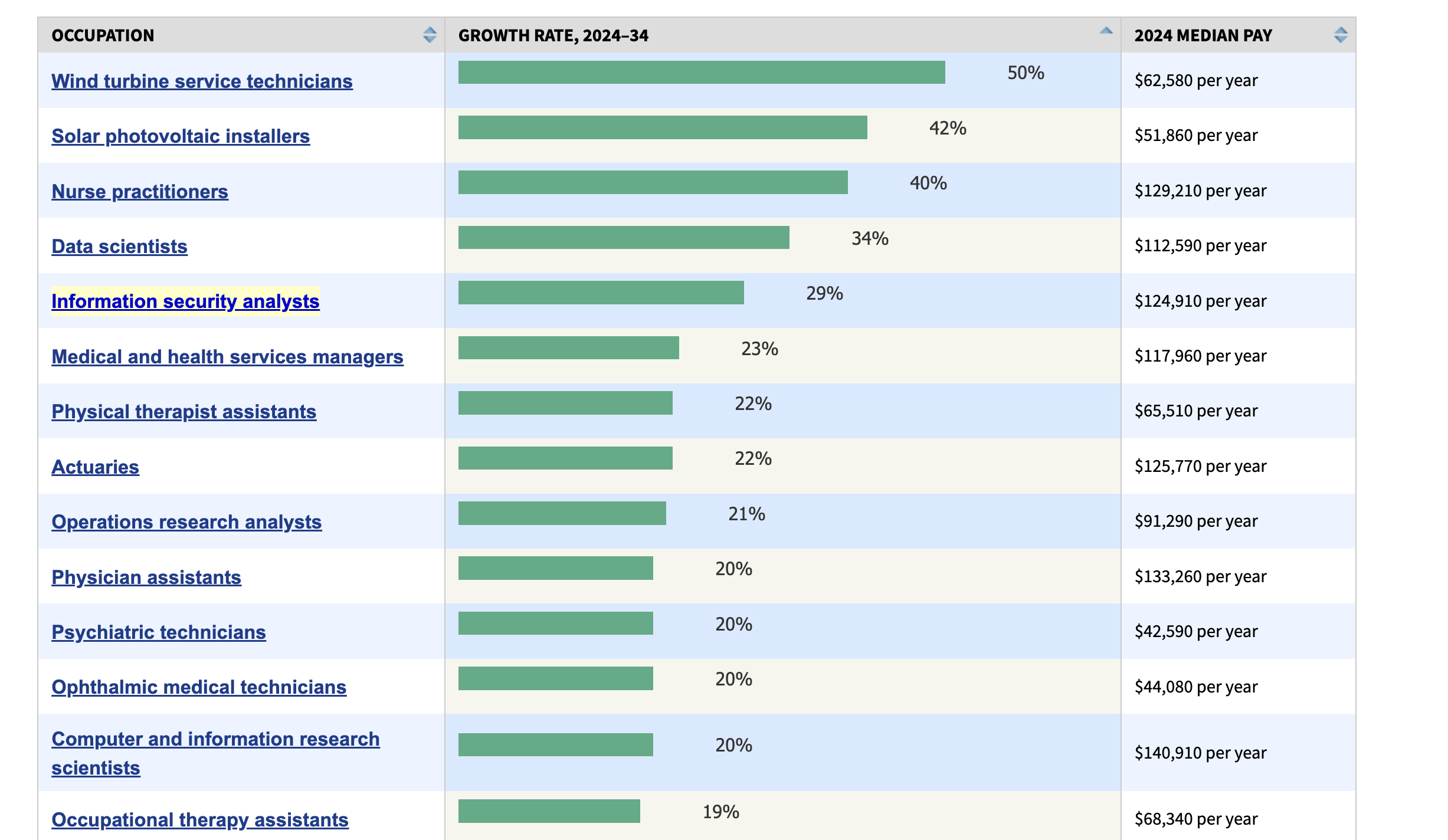 Selon le Bureau of Labor Statistics, les métiers qui vont connaître les plus fortes croissances dans les 10 prochaines années sont précisément ceux liés à la donnée, à l'automatisation et à l'intelligence artificielle :